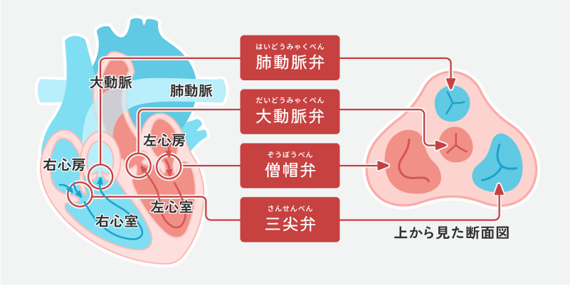 心臓には左心房と左心室の間にある「僧帽弁」、左心室と大動脈の間にある「大動脈弁」、右心室と肺動脈の間にある「肺動脈弁」、右心房と右心室の間にある「三尖弁」の4つが存在します。これらの弁が心臓の拍動に合わせて正確に開閉することで、全身に効率よく血液を送り出す重要な役割を担っています。