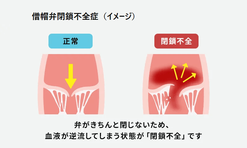 閉鎖不全症は、弁の組織が変性したり断裂したりして、完全に閉じなくなる状態です。これにより、送り出した血液の一部が逆流してしまうため、心臓は通常より多くの血液を送り出そうと働き、心臓が拡大します。逆流する血液量が増えると、動悸や呼吸困難、むくみなどの症状が現れます。