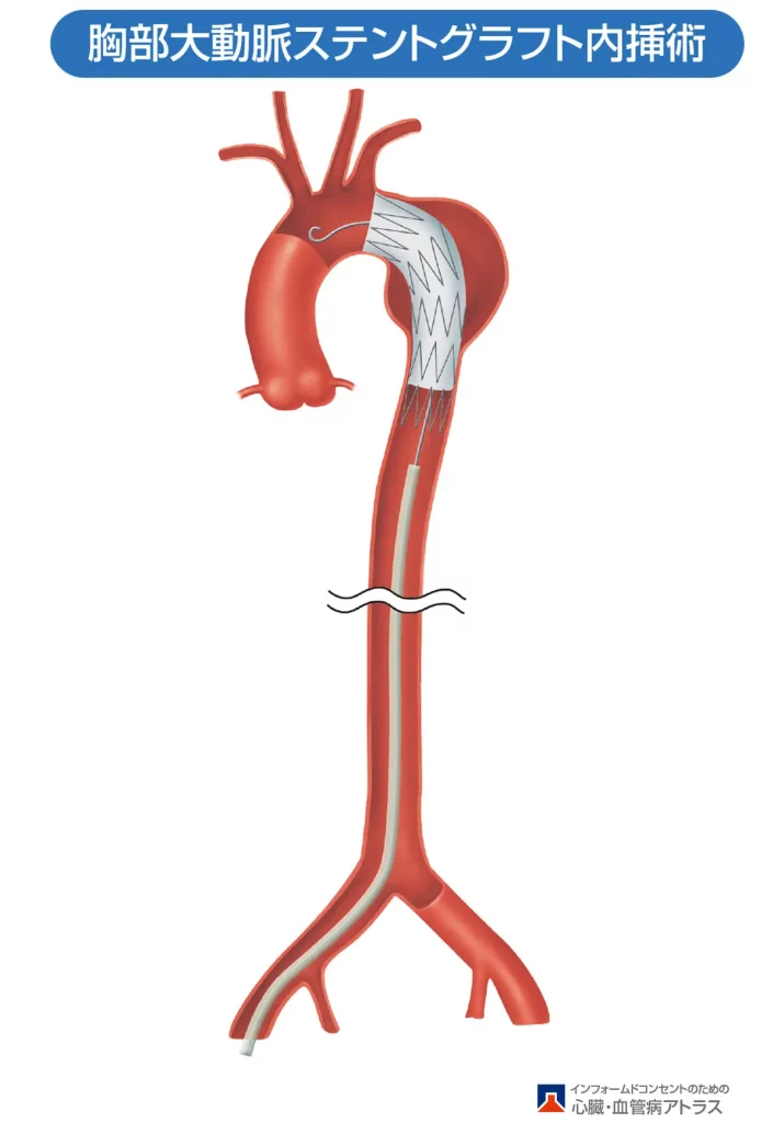 この治療は、胸を大きく開く(開胸する)ことなく、足の付け根の血管からカテーテルという細い管を挿入します。そして、折りたたんだ状態のステントグラフト(金属の骨組みを持つ人工血管)を動脈瘤の部分まで運び、内側から広げて留置します。これにより、動脈瘤に血液が流れ込まなくなり、破裂を防ぎます。