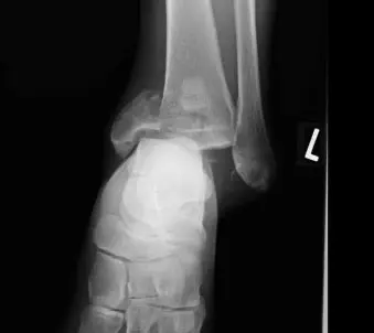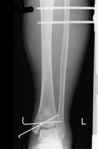 本症例は受傷直後に軟部組織の損傷を強く認め(足関節周囲は軟部組織が非常に薄い)、一期的なORIFは困難な状態であった。本症例のように軟部組織の損傷を強く認める状態でのORIFは感染、皮膚壊死といった問題が生じる危険性がある。そのため、軟部組織の回復まで一時的に鋼線牽引療法(traction)や創外固定術を施行し、軟部組織の炎症・腫脹が回復してきた後にORIF(two stage surgery)を施行する。