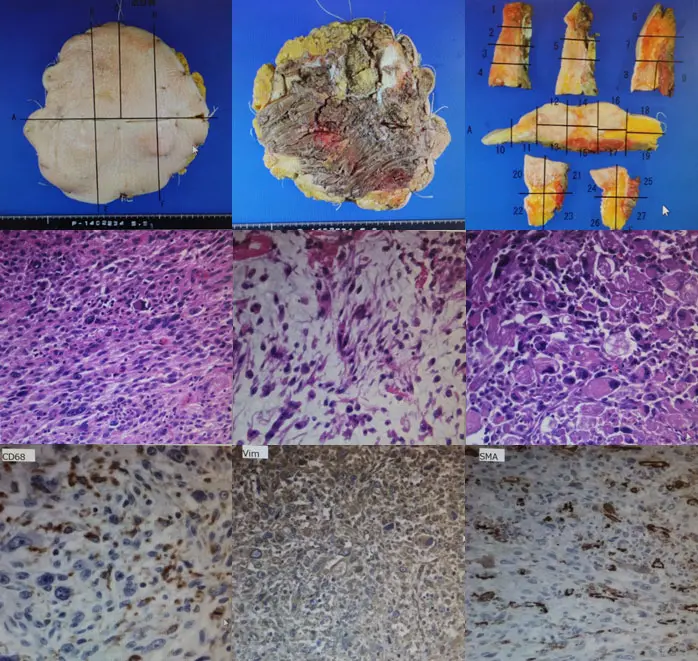 核の腫大、大小不同、多核化、多形性などの異型性を示す紡錘形細胞の不規則束状の増生を認め、多くはビメンチン免疫染色に陽性、一部で平滑筋アクチンやS-100蛋白、CD68が陽性であった。