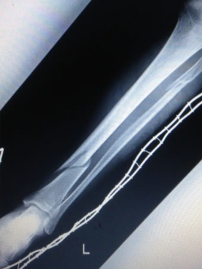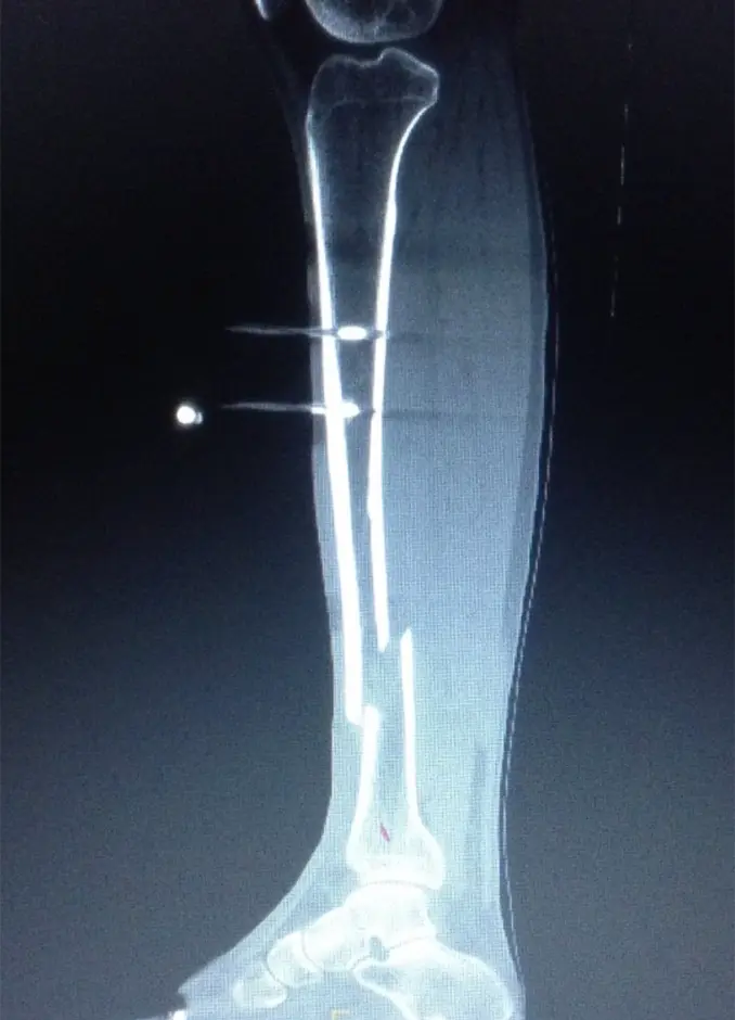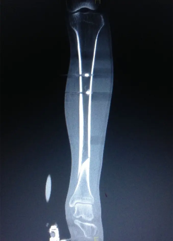 初診時のX線にて脛骨遠位骨幹部、腓骨近位部、それぞれにらせん骨折(Müller AO分類 42-A1)を認めた。