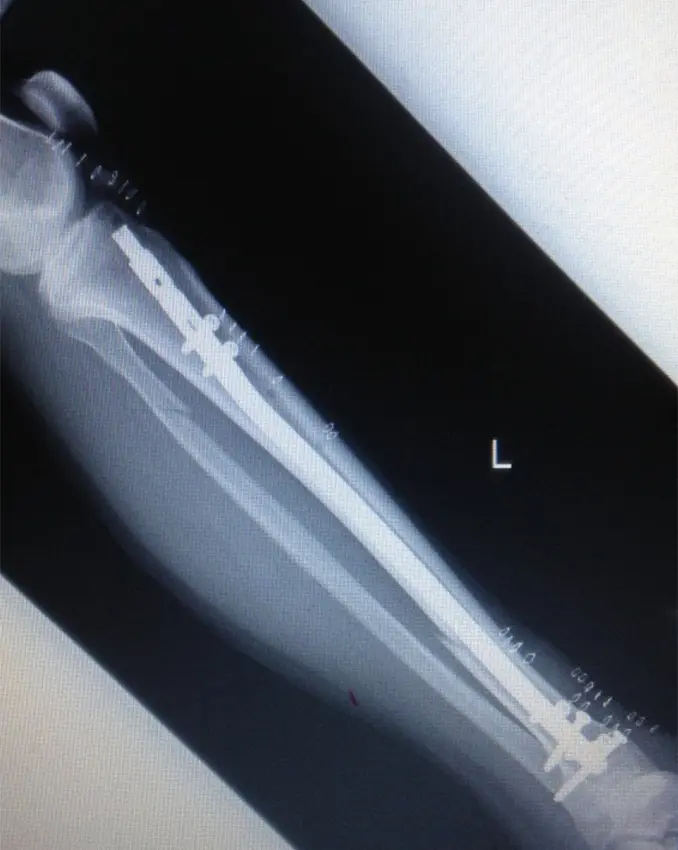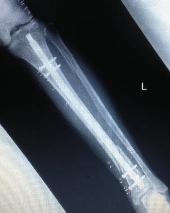 ターニケット未使用、体位は仰臥位で膝関節軽度屈曲位にて手術を行った。皮切は外側関節裂隙から膝蓋骨関節縁とした。外側膝蓋支帯を切開、膝蓋腱および関節包の間を剥離、ガイドピン刺入部を露出した。ガイドピンを刺入し、ドリリングした後、ガイドワイヤーを挿入。遠位骨片にブロッキングピン刺入後、徒手的に整復しながら径12.5mmまでリーミングし、径11mm、長315mmのSynthes社製 Expert Tibial nailを挿入した。近位はスクリュー2本、遠位スクリュー4本挿入固定とした。固定性良好であることを確認し、エンドキャップを挿入、洗浄閉創し手術終了とした。