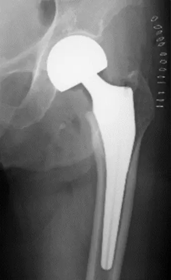 側臥位にて骨板固定器にて体位を固定し、股関節後方アプローチを施行。大腿方形筋近位を1/3~1/2程度切離し、下双子筋と大腿方形筋間を確認したうえ、下双子筋より近位の外旋筋群(下双子筋、内閉鎖筋、上双子筋および梨状筋)を近位へレトラクトする。外閉鎖筋を切離し、下双子筋よりやや近位で下双子筋と平行に関節包、坐骨大腿靭帯を切開する。関節包、坐骨大腿靭帯を切開した後に骨頭を抜去し、骨幹部を小転子より1横指近位で骨切りし髄腔をラスピングしたうえで、人工骨頭トライアルならびにインプラント(Cup 44mm, Stem size6, Neck +3mm)を挿入。試験整復を行い、屈曲60度・内旋90度で脱臼せず、90度 内旋90度で脱臼しない事を確認。創内を十分に洗浄後、外閉鎖筋腱と関節包をファイバーワイヤーにて大腿骨に強固に縫合し、閉創。