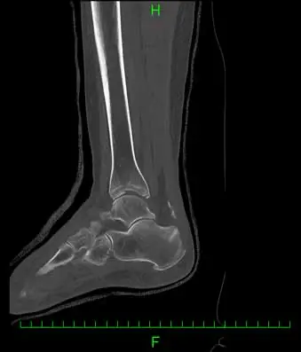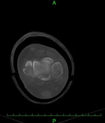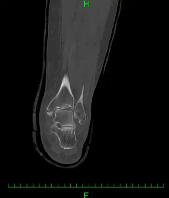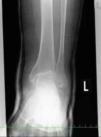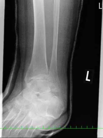 足関節内外果骨折、脛骨天蓋部に5mmのstep offを伴う陥没骨折と踵骨アキレス腱付着部より1.5cm近位に骨片を認める。