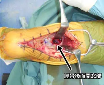 受傷12日目に腹臥位にて手術(手術時間:180分)を施行した(図3)。内果骨折に対しては経皮的に4.5mm cancellus screw2本を挿入、外果骨折はMIPO法に準じ1/3円プレートにて固定した。次にアキレス腱後外側に径10cm程の縦皮切を加え、脛骨後面を露出した後に関節面より3cm近位側を1x2cm程開窓した。イメージ下に脛骨天蓋部関節面を整復しオスフェリオンを骨欠損部に充填、cancellus screw2本にて固定した(図4)。踵骨アキレス腱付着部裂離骨折は、裂離骨片を4.5mmスパイクワッシャー付cancellus screwで固定し、さらにLeeds-Keio人工靭帯をアキレス腱に縫合、踵骨に開けた骨穴に通して補強した(図5)。