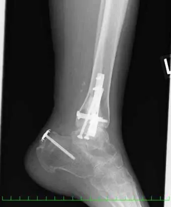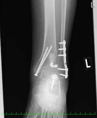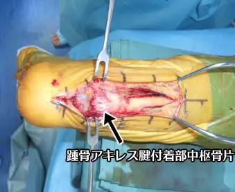脛骨内果はcancellus screw2本、腓骨外果は1/3円プレート、脛骨天蓋部は骨欠損部にオスフェリオンを充填し、cancellus screw2本にて固定している。踵骨裂離骨片はスパイクワッシャー付cancellus screwにて固定し、Leeds-Keio人工靭帯にて補強している。