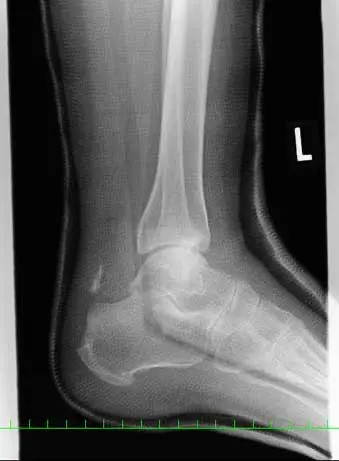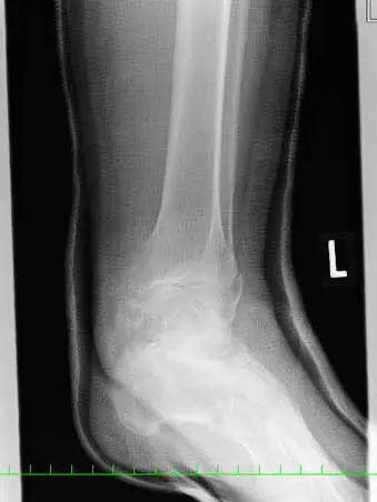 足関節内外果、脛骨天蓋部に骨折と踵骨アキレス腱付着部より1.5cm近位に骨片を認める。