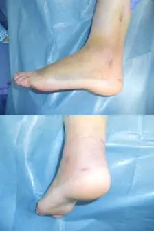 治療方法については足関節果部、脛骨天蓋部骨折、踵骨アキレス腱付着部裂離骨折の整復固定が必要なため長時間の手術、術後の腫脹が予測され、腹臥位にて一期的に手術を行った。