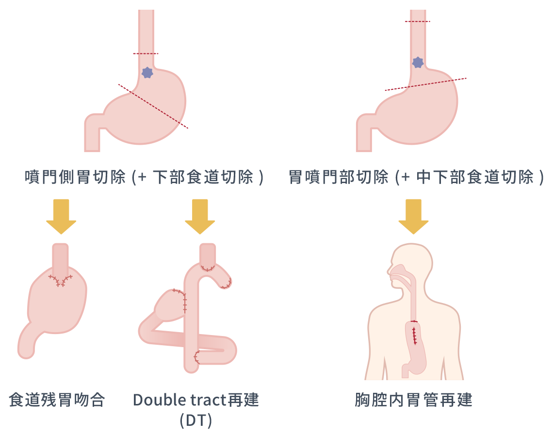 切除後の再建法として食べ物の逆流を防止出来て、胃を残せる食道残胃吻合法を採用しています。