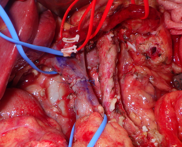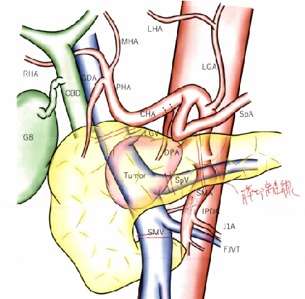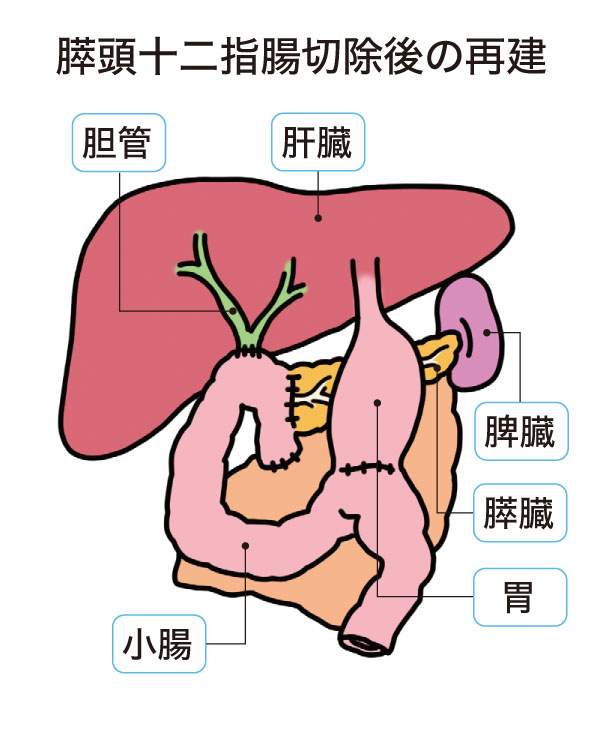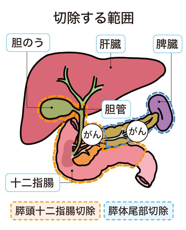 がんのある部位を切除して再建する手術です。がんが膵体部や膵尾部にある場合は「膵体尾部切除術」を、膵頭部にある場合は「膵頭十二指腸切除術」を行います。「膵体尾部切除術」は胸腔鏡手術が主流となっており、ロボット手術も行っています。がんの根治(がんをとりきる)を前提としたうえで、なるべく患者様の身体に負担が軽い手術が行われます。