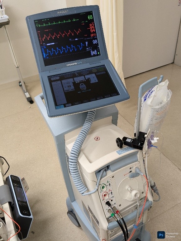 経皮的心肺補助:ECMO:extra-corporeal membrane oxygenationとは、心肺機能が低下している症例に使用され、一時的に心臓と肺の機能の代行をする装置で、外科や循環器科だけでなく救急科領域でも導入されています。カテーテル室においては、心源性ショックなどに循環補助として使用されCEが管理や準備・操作を任せられています。