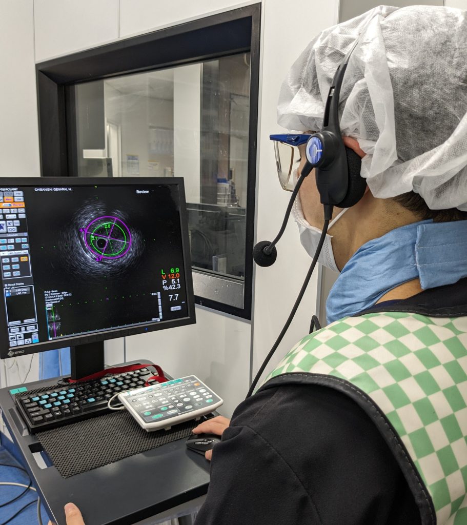 Interventionには大きく分けて二つの治療があります。経皮的冠動脈インターベンション:Percutaneous Coronary Intervention(PCI)と、末梢血管インターベンション: Percutaneous Peripheral Intervention(PPI)です。検査同様、ポリグラフを使用し患者のバイタルサインを監視・記録します。また、Interventionで使用される物品出しや、IVUS、OCTなどの機器を使用し血管径や血管内腔、プラークの性質などを計測・解析をします。血管径の測定はBalloonやStentのサイズを決めるに当たって非常に重要な解析となります。