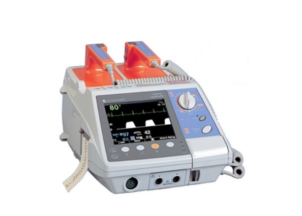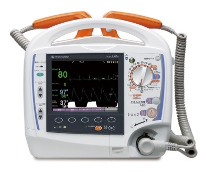 Vf(心室細動)やVT(心室頻拍)で不規則に動いている心臓に電気ショックを加え、心臓の電気信号をリセットさせて正常な心臓のリズムに戻す機械です。また、デマンド(自己心拍を感知した場合はペーシングを休み、自己心拍がなければペーシングする)やフィクス(設定した心拍数でペーシングし続ける)などの体表ペーシングやAEDの機能を兼ね備えています。