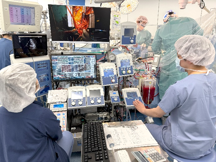 心臓・大血管手術では、一時的に心臓と肺の機能を停止させる必要があります。そのため、私たち臨床工学技士が人工心肺装置を用いて心臓・肺の機能を代行し、全身の血液循環・ガス交換を行っています。