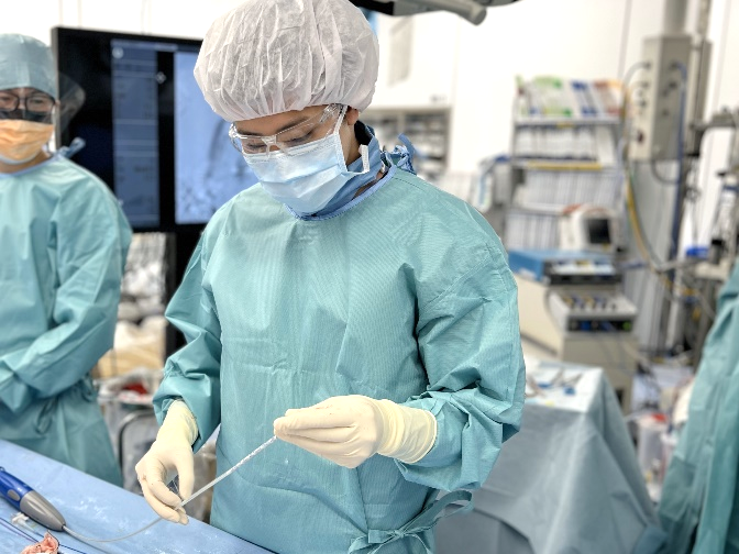 2023年3月より、TEER(経皮的僧帽弁接合不全修復術)を行っています。高齢やリスクが高く外科治療の適応とならない患者さんに対し行います。大腿静脈から心房中隔へアプローチし、カテーテルによって僧帽弁へクリップを留置します。臨床工学技士は、外回り及び急変時の対応(ECMO等)2名体制で行っています。