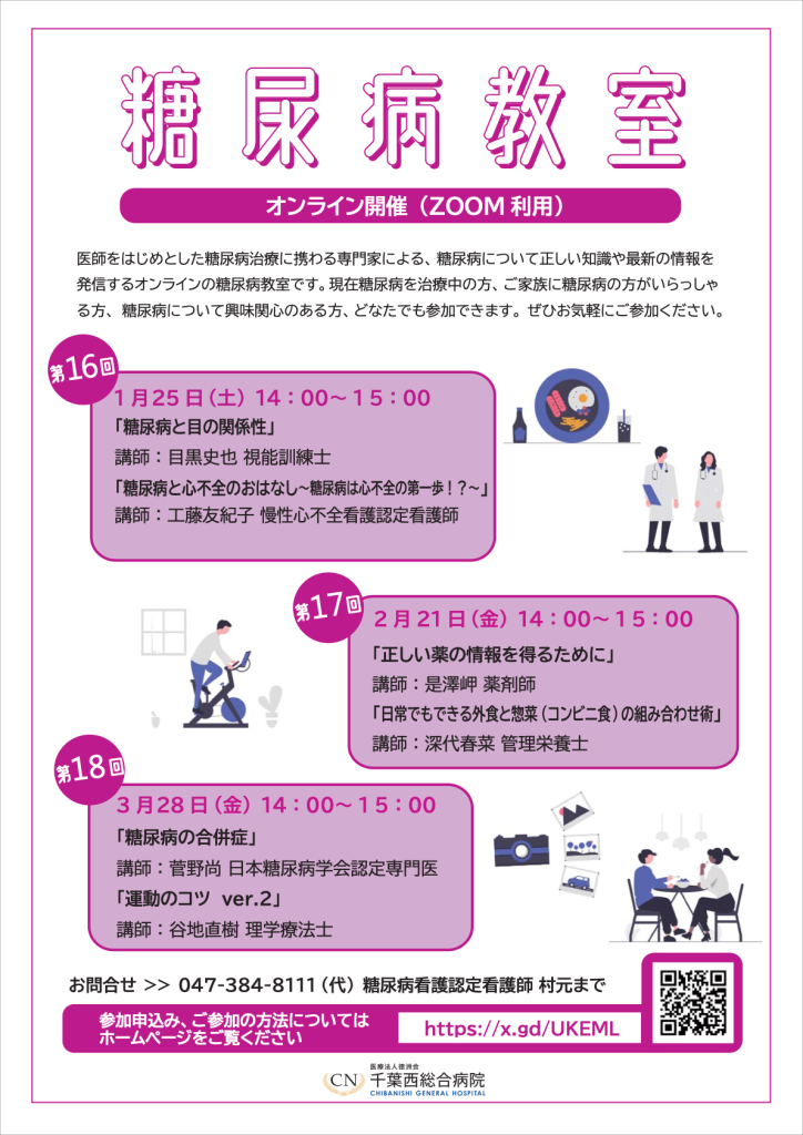 患者様、ご家族様をはじめとした糖尿病に興味・関心のあるすべての方を対象に、糖尿病の正しい知識や最新の情報を発信します。当院では月に1回オンライン(ZOOM)で実施しています。講師は医師、看護師、理学療法士などの専門職種が担当し、それぞれの専門分野にまつわる情報をお伝えします。