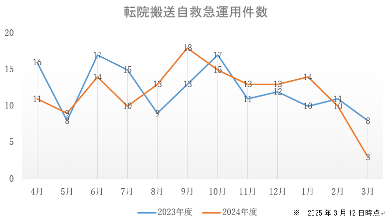 当院は救急車を3台所有しており、消防機関に依頼するのではなく転院搬送を当院の救急車(自救急)での運用を目標にしています。