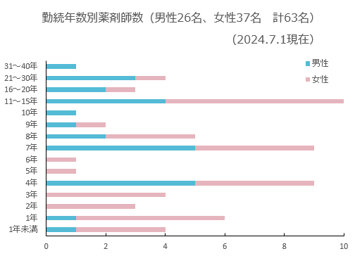 薬剤師人数:63名(男性26名・女性37名)、薬剤師助手:女性3名(令和6年10月現在)、顧問:1名