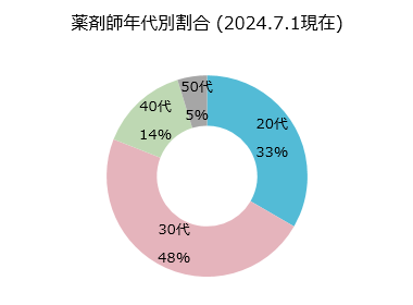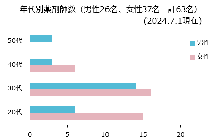 薬剤師人数:63名(男性26名・女性37名)、薬剤師助手:女性3名(令和6年10月現在)、顧問:1名