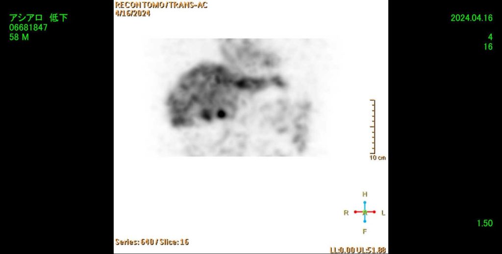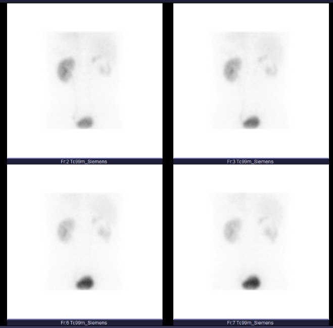 腎臓はいくつかの機能を担っていますが、その中でも血液浄化機構は腎臓の最も重要な機能になります。その機能を左右の腎臓で別々で調べられる(分腎機能)検査になります。前処置としてペットボトル1本の水を持参していただき、検査開始30分程前から飲んでいただきます。