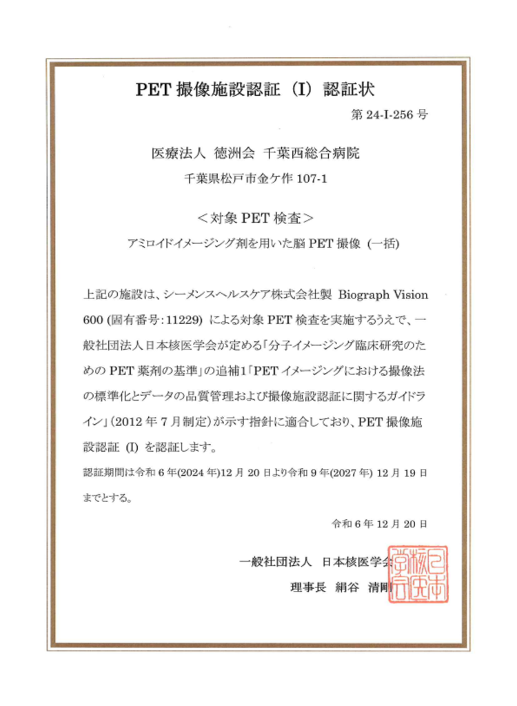 当院は本認証を取得しているため、アルツハイマー型認知症の原因とされているアミロイドβの脳内沈着を調べるアミロイドPET検査も実施可能です。