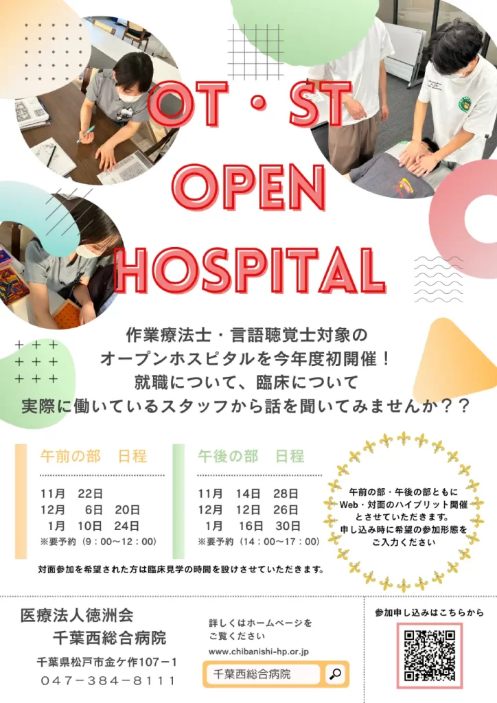 作業療法士・言語聴覚士を目指す学生を対象としたオープンホスピタルを開催いたします。急性期・回復期・小児外来で働くOT・STがどのような仕事をしているのか、気になることを実際の現場を見ながらお話しませんか?たくさんのご参加待っています!