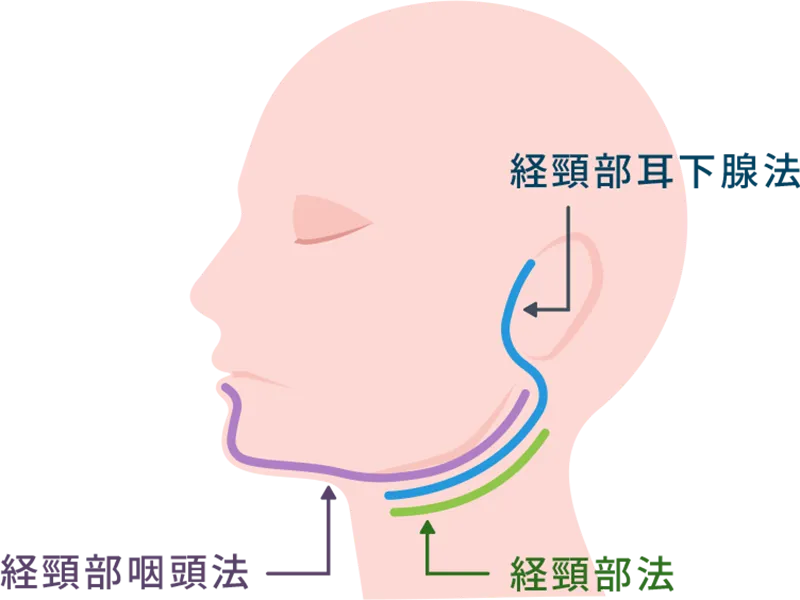 治療をしないと徐々に大きくなり咽頭や周囲の神経への圧迫が発生するため、発見された場合は手術により切除・摘出を図ることになります。手術は切開する範囲によって複数の術式がありますが、患者様の負担を抑えるため、切開が小さくて済む経頸部法をなるべく用います。