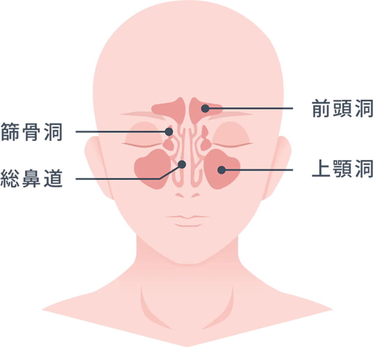 鼻の中の空気の通り道を鼻腔(びくう)といい、その周囲にある鼻腔と繋がる部屋(空間)を副鼻腔と呼びます。副鼻腔には前頭洞・蝶形骨洞・篩骨洞・上顎洞の4つがあり、これらの部位に発生するがんを副鼻腔がんと呼びます。