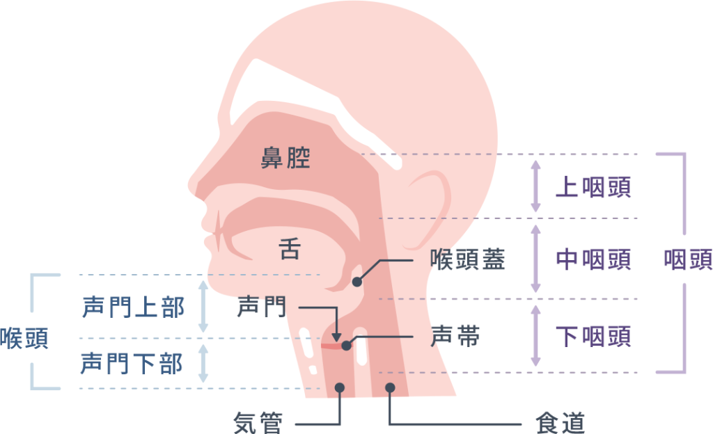 鼻の奥から食道につながる部位を咽頭(いんとう)といい、この部位にできる悪性腫瘍を咽頭がんと呼びます。咽頭は上から上咽頭・中咽頭・下咽頭の3つに分類されます。